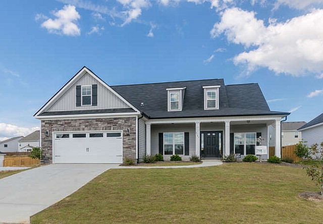 Custom built home on Grove Landing Way. This new construction home offers 4 bedrooms, 3 full bathrooms & 2,089 of open concept living space. Wide covered front porch is perfect for rocking chairs. Inviting foyer welcomes all guests. Huge great room is accented by a soaring vaulted ceiling. Spacious kitchen features: granite countertops, stainless appliances, center island w/sink, bar seating, ample wall cabinetry, pantry, breakfast area w/bay window & attached formal dining room w/natural light. Main level owner's suite is highlighted by large windows, ceiling fan, attached bathroom w/soaking tub, separate shower, his/her sinks & walk-in closet. 2 additional bedrooms, 1 full bathroom, mud room & laundry room w/shelving remain of the main level of home. Gigantic 4th bedroom/bonus room on upper level w/attached full bathroom & walk-in closet. Covered rear patio, concrete patio & large flat backyard are perfect for outdoor entertaining!!! Neighborhood pool, clubhouse & 2 stocked ponds!!!