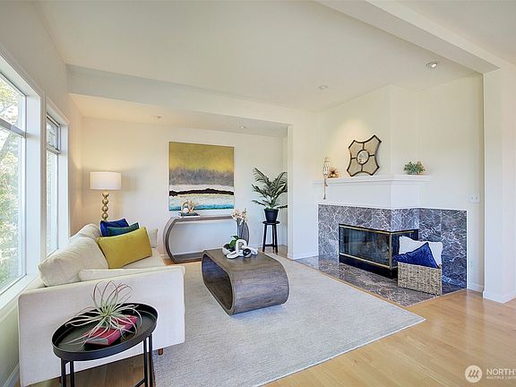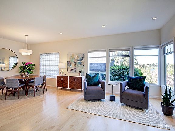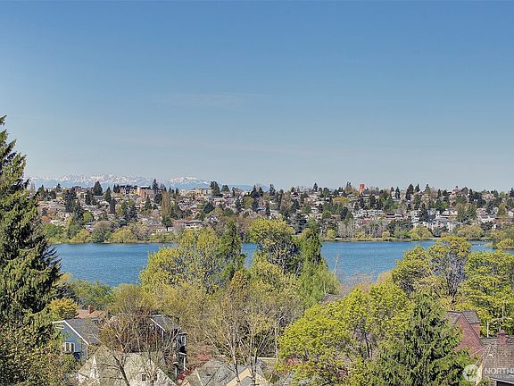 Charming Green Lake home with stunning views of the lake and Olympic Mountains. The main floor features a bright, open-concept living/dining area, private office, powder room, and thoughtfully renovated kitchen, baths, and laundry. Upstairs offers three bedrooms, including a spacious primary suite with view deck, walk-in closet, luxurious bath with soaking tub, double sinks, separate shower, and heated floors. Enjoy a serene garden deck with built-in seating and mature landscaping. Two-car garage off alley includes ample storage, sink, and two EV chargers. Rooftop deck and level entry from garage to house complete this exceptional home.