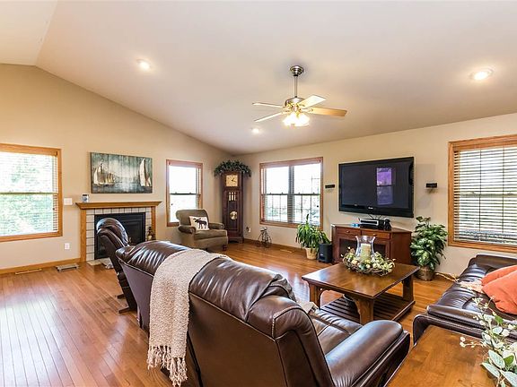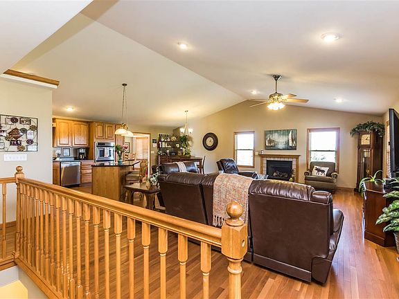 Immaculate 4 bed, 3 bath home on 2 acres! This breathtaking open concept ranch has over 2600 finished square feet & includes beautiful hardwood floors, fireplace, cathedral ceilings & unlimited storage. Convenient 2 stall attached garage. Kitchen features an island, breakfast bar and stainless steel appliances. Large master suite with a whirlpool tub and walk-in closet. Finished basement with family room & wet bar. Property also includes an additional 2 stall detached garage with in floor heating and a tankless water heater. A/C installed 2017. Large deck in back, great for entertaining!