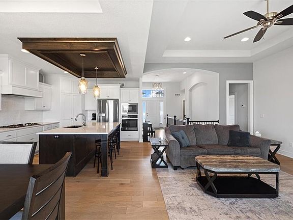 This charming 4-bedroom 3-bath ranch is a rare find among the recent new construction of the Foxfield Villas development. From the front door on a tranquil cul-de-sac lined with sidewalks, this home is headquarters for access to an array of local amenities. Various shopping and dining destinations are but a short drive away. The location is also convenient to nearby schools. The attractively landscaped yard comes with rear fencing for seclusion. Savor the sunset from your vantage point on the breezy rear porch. Inside, the home contains a bounty of comforts. The rooms are illuminated both by plenty of sunlight and by stylish fixtures. The neutral color palette offers maximum makeover freedom. Even the ceilings are remarkable. The efficient gas fireplace will serve as a picturesque backdrop to many living room gatherings, or serve as the centerpiece for a few minutes of solitary tranquility. The kitchen is a delicious concoction of granite counters and major appliances. A classic island configuration maximizes workspace and flexibility. The primary bedroom offers the luxury of tranquility as the days begin. In addition to the convenience of the private bathroom (walk-in shower), you will find plenty of walk-in closet space to let your wardrobe breathe. The other 3 quiet bedrooms offer space and distance. A double-wide driveway makes ample room for visitor parking and is connected to an attached two-car garage. The finished basement, with the convenience of two bedrooms, a full bathroom, a living room, and a wet bar, allows for an easy entertainment area and guest sleeping quarters. Open the front door to a pleasant new life here in Olathe