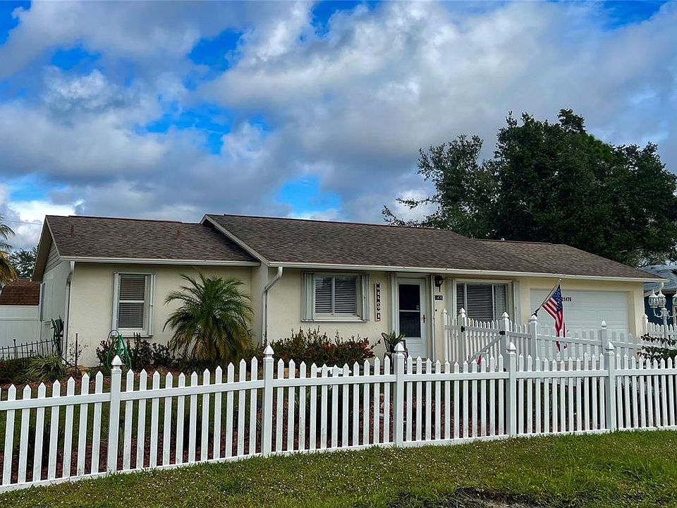 SO MUCH CURB APPEAL... ATTENTION PET LOVERS this fenced-in Cozy ranch with GARAGE for you and your fur babies! Lots of landscaping, surrounded by a charming white vinyl picket fence in the front and a 6' Vinyl privacy fence in the back yard! Convenient location, close to hospitals, schools, shopping and restaurants, and boat ramps. 15 minutes to Fisherman's Village Shops. Wonderfully updated kitchen, new wood cabinetry, gleaming granite tops, elegant glass backsplash, and updated tile flooring. GE appliances! (fridge is Whirlpool) HUGE storage/utility Room with additional updated cabinetry. Maytag Washer & Dryer! Vaulted ceilings in the Kitchen and Living Room BATHROOM Vanities have been updated with granite tops as well. The primary bath has dual sinks and granite counters! Move-in Condition!! TILE FLOORING throughout. 3 Ceiling Fans for air movement. Guest Bedroom comes with built-in Queen sized, Murphy Bed and office storage/ desk area. 12 x 30 cement pad off the kitchen, great for outside lounging! Picture, perfect home waiting for you. MOVE IN AND ENJOY ***LIST OF IMPROVEMENTS*** **ROOF put on in 2016, ***AC unit replaced in 2019, ***HOT Water heater 2022, ***Vinyl Fence 2009, House REPLUMBED 2020, Wind Rated Garage door, 2016, ***ACCORDIAN storm shutters for all windows and doors, ***12x10 TUFF Storage Shed on cement Pad, 2017. ***200 AMP electrical Panel," SQ D", 2016, *** Rain Gutters. ***About 85%+/- of the FENCE was replaced 2022!