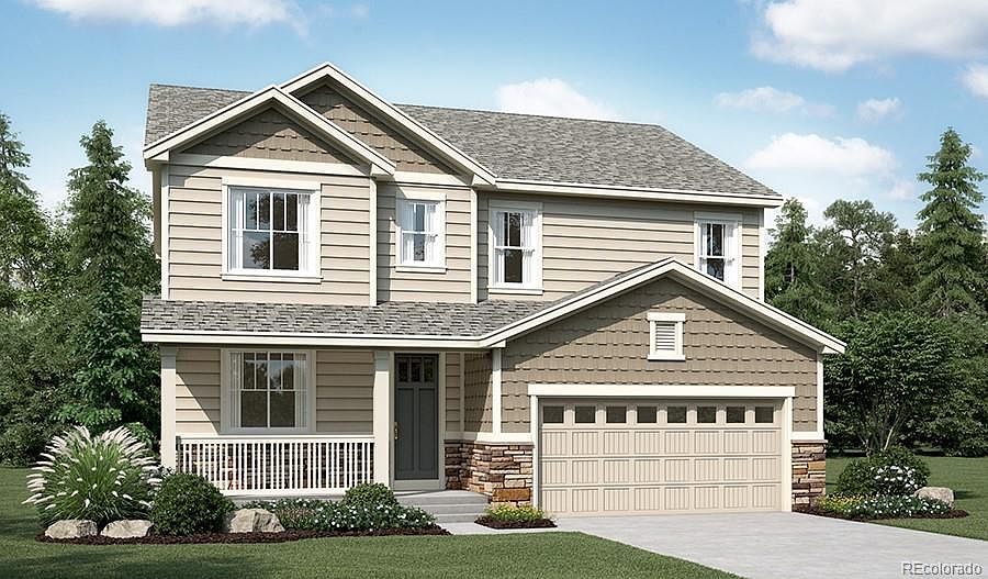 This plan features an entryway with adjacent flex space with double doors for privacy. At the back of the home, you'll find a great room with a corner fireplace, a large kitchen with large island and walk-in pantry and a sunroom at the back. Upstairs you'll find a lavish master-suite, 3 additional bedrooms, a bath and laundry room all surrounding a spacious loft. Finished basement add another bedroom, bathroom and large rec room. One of Thornton's newest communities, Fairfield offers direct routes to DIA, Denver and Boulder via E-470 and I-25. Residents will enjoy community park/playground, close proximity to golf courses, award winning Adams 12 schools, ball fields, parks, restaurants and more.