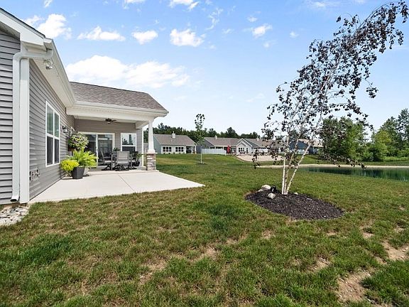 Welcome to this exquisite 3-bedroom, 2-full bath ranch nestled within the serene landscapes of Cottages of Catania. Built by Majestic Homes, this remarkable Merlot model is a true embodiment of luxury living, boasting an array of top-tier upgrades and features that redefine comfort and elegance. As you step onto the property, you're greeted by a covered front porch that sets the tone for the refined interior that lies ahead. The inviting foyer beckons you to explore the meticulously designed spaces within. The versatile den, which could easily serve as a third bedroom, boasts elegant glass French doors and generous closet space, providing both functionality and style. Enter the great room, where a soaring cathedral ceiling creates an air of grandeur, perfectly complemented by the corner stone gas log fireplace, complete with a bespoke custom mantle. The heart of the home is the chef's island kitchen, adorned with high-end Frigidaire appliances, custom cabinets with glass doors and a wine rack, and a chic tile backsplash that adds a touch of sophistication. The breakfast bar invites casual gatherings, while the adjacent dining area offers panoramic views of the lush surroundings, extending to the four-season room—an oasis of relaxation with its tranquil pond vistas. The master suite is a haven of luxury, featuring a trey ceiling that adds dimension to the space, and a sliding barn door that leads to the well-appointed master bath. Revel in the opulence of double vanities, a walk-in tile shower, and a generously sized closet equipped with innovative closet tamers. The split bedroom concept places the second bedroom next to the den, allowing for privacy and convenience. This bedroom shares the main full bath, which continues the theme of elegance and functionality. This residence exudes a sense of refined living with its custom-made window treatments, hardwood floors, and upgraded faucets throughout. The extra-large laundry room is a testament to both form and function, boasting custom cabinets with drawers and a sink for added convenience. Step outside to find two inviting patios—the first covered and overlooking the picturesque pond, offering a serene backdrop for outdoor relaxation and entertaining. Professionally decorated and impeccably maintained and ready to welcome its new owner to a life of unparalleled luxury. Schedule your showing today!. Your dream home awaits!