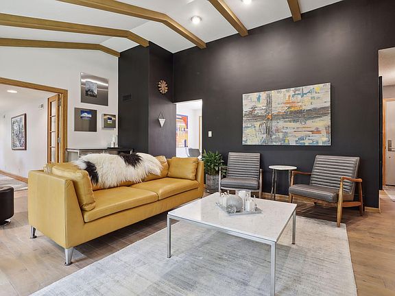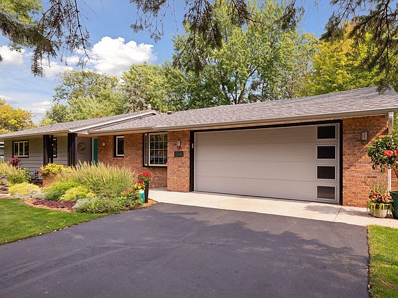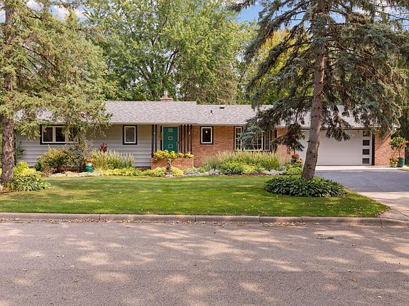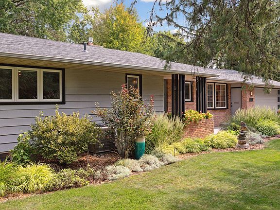Meticulous Mid-century modern with artistic flair and loaded with updates. Located on a quiet tree-lined street with no thru- traffic, this Classic features a dramatic vaulted beam ceiling in the living room with floor-to-ceiling brick gas-burning fireplace. This gorgeous home has a smart floor plan with walls of windows facing the backyard for privacy and the elevation gives it a treehouse feel. Highlights include-Updated kitchen w/ cherry cabinetry, quartz counter tops, tile floor & informal dining with bay window. New walnut floors harvested in Southern MN w/ chemical free veneer, custom Norwegian gas fireplace insert, large formal dining w/ seating up to 14, newer spa bath w/ double sinks, separate tub & shower & heated floor. The full walk-out lower level has a large family room w/ fireplace, wet bar, 4th bedroom, bath and lots of storage. New roof & gutters w leaf guards-2020, water purifying system, new paint inside & out, custom lighting, extensive landscaping.
