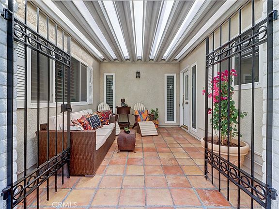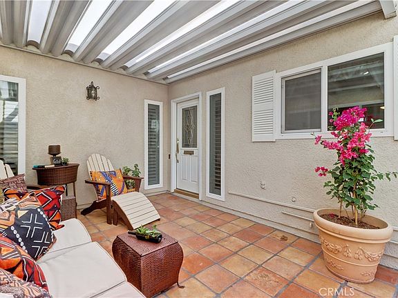 Charming Cordoba (2 bd/2ba/den) located in Laguna Woods Village - the premiere 55+ community. This home is an end unit tucked away in a nice cul-de-sac.. As you enter the home, you will notice the spacious living room. The atrium/patio has been enclosed giving you additional sq. ft. of living space for an office, larger dining room or den. There is an electric fireplace, wet bar, skylights and a sliding glass door making the room perfect for entertaining. The kitchen was recently updated with new appliances and recessed lighting. There is a window overlooking your private patio making the kitchen light and bright. The patio is beautifully tiled and is covered to provide shade. Both bathrooms have been remodeled with new vanities, faucets, mirrors and flooring. The primary bedroom offers enough space for a king size bed and there is plenty of closet space. Other great features include a washer/dryer, double-paned windows, smooth ceilings, crown moulding, ceiling fans and new flooring throughout. Parking is very convenient – just a few steps from the front door. The Village is near Laguna Beach and offers many great amenities such as: 27-hole golf course, tennis courts, separate pickle ball courts, five swimming pools, three fitness centers, seven clubhouses including Clubhouse 4 offering amazing classes in art, ceramics, wood shop, jewelry-making, and sewing, and much more. The HOA includes water, sewer, trash, cable TV and landscaping. Come and see this move in ready home!