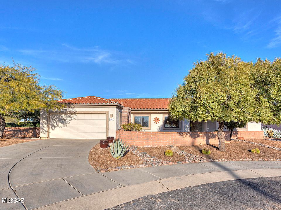 On the western cul-de-sac in San Ignacio Ridge Estates, this 1,790 sq. ft. 2 bedroom 2 bath home has had ,over the years, major updating in the kitchen with new cabinets, appliances and granite tops, tile flooring in all but the two carpeted bedrooms, update vanities and tops in both baths. The floor plan flows from the dining area through the kitchen and family room to the expansive back porch with views of the Santa Rita Mountains. The front room can serve as a living room, reading area, or other functions as desired. The master bedroom and bath are ample size. Guest bedroom and bath are accessed from the foyer area. The office and laundry area are off the kitchen. Soldier walls and lush landscaping provide a private landscaped setting. A great property to call home.