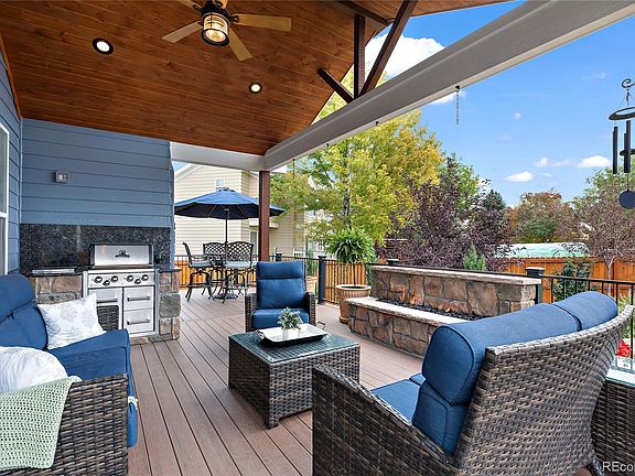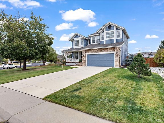 Welcome to this beautiful two story home nestled in the much desired Villages of Parker. Situated on a spacious lot (.31 acres) on a cul de sac, backing to a greenbelt & boasting many improvements throughout. This home boasts curb appeal, a darling covered front porch & spacious back yard w/mature perennials, trees & space to play. Your outdoor entertaining oasis awaits! In 2020, Sellers had this stunning custom vaulted covered deck w/built in stoned fire pit, thoughtfully built w/year-round relaxation & entertainment in mind. Get ready to BBQ on your built in gas grill & enjoy the dining area & spacious covered sitting area; S'mores & cookouts will be delightful here. Beautiful hardwood floors welcome you to the formal living room, dining room, 2 story family room & eat in kitchen. Entertaining will be a delight in the well appointed kitchen featuring stainless steel appliances, slab granite counters, island, ample cabinet space, built in pantry cabinet & beautiful custom French door. Open to the kitchen, the inviting two story family room features a gas fireplace w/blower & plantation shutters. Convenient main floor powder room & laundry room featuring a utility sink. As you head upstairs, you'll be welcomed by a spacious primary suite featuring, a sitting area, bathroom ensuite w/soaking tub, shower, dual sink vanity & spacious walk in closet w/ built ins. Down the hall are 2 well appointed guest bedrooms & shared bathroom w/dual sink vanity & shower/bath combo. The 1,039 sq ft basement has a finished bathroom w/large walk-in steam room/shower, sink vanity, a partially framed office. The rest of the basement is ready for your personal touch! *NEW IMPACT RESISTANT ROOF & *5 YR OLD FURNACE & A/C,*5 YR OLD AIR PURIFIER,*2019 EXTERIOR PAINTED,*NEWER GARAGE DOOR. Home includes: radon mitigation system, Smart thermostat & ring doorbell. Award winning schools, near Downtown Parker, trails, parks, community pool, tennis, shopping, dining & many amenities.