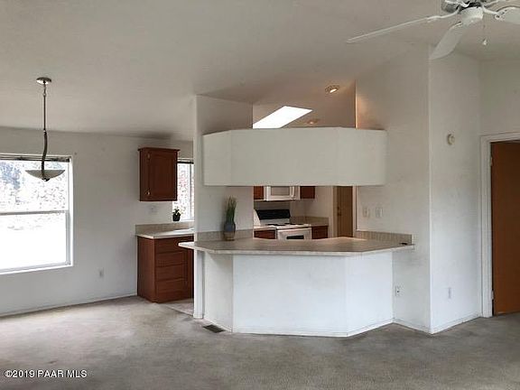 Fantastic views from this home in Prescott Canyon Estates. Private location with open area space beside and behind. A private retreat with 2 covered porches, a covered back patio plus an open patio to enjoy more views. Spacious home offering 2 bedrooms and a large den. This home also features a one car garage, carport and lots of extra storage. The existing home warranty is good through 2022. Prescott Canyon Estates includes a great clubhouse, work out area, indoor swimming pool and lots of activities for the 55 plus.