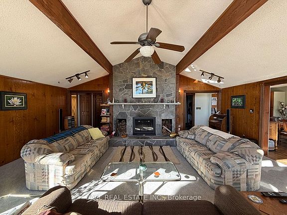 Charming 4-season lakehouse on White Lake! 335ft of waterfront on a park-like, level .75-acre lot with your own .25-acre private island out front! Set at the end of a small year-round private road, with level entry to this lovely bungalow with detached garage + carport. Featuring 1498sqft of space, 3 bedrooms, 4pc bath and laundry room, furnished for turnkey waterfront living! Bright vaulted lakeview great room with a striking stone fireplace, and kitchen open to dining room with walkout to a large waterfront deck. Many updates including decking, dock, stone fireplace, owned HWT & more. Sunny southwest exposure with private island views for ultimate waterfront privacy, with a neighbour on only one side. Just 20 mins to Lakefield, 30 mins to Peterborough and 3 mins to renowned Wildfire Golf on Stoney Lake!