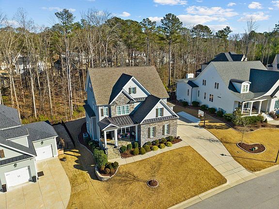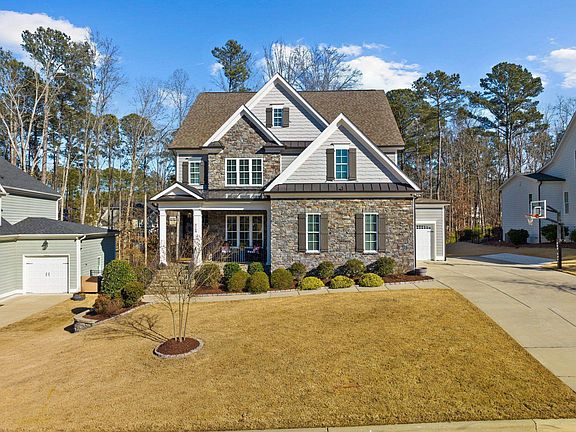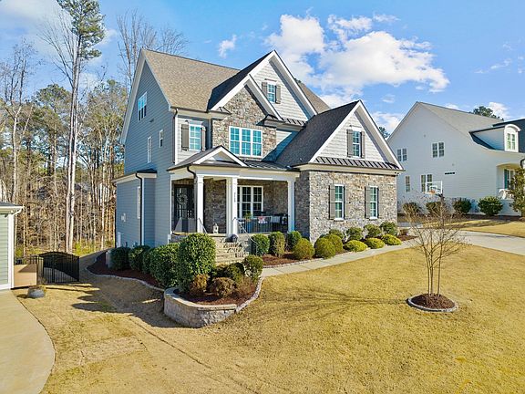 Beautiful 5-bedroom custom built home located in highly desirable Bella Casa! All 5 bedrooms include their own full private bath and large walk-in closet. This open concept home features a large kitchen island with a leathered granite countertop, stainless steel appliances and great for entertaining. Some additional features include hardwood floors, custom arched doorways, built in book cases, multi-zone home audio system, a gorgeous coffered ceiling in the dining room, and landscape lighting. The finished third floor is perfect for a playroom, arts and craft room, or man cave. There is also plenty of unfinished space on the third floor for storage or future living space. Screened in back porch leads to large flagstone patio and firepit seating area creating an ideal outdoor entertaining area. The wooded area behind the home provides great privacy. Home is a short 3 minute drive to jump on 540 - convenient for anyone commuting to RTP. ***Be sure to find the link and watch the virtual tour of this beautiful home!*** Schedule your showing today!