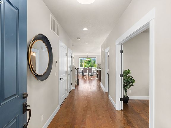 Located in a peaceful neighborhood in the heart of Sherwood! This contemporary home offers ideal balance between style & function with views of the greenspace! As you arrive you're greeted by level front lawn & covered outdoor patio. Interior with soaring 9 FT ceilings & engineered hardwoods thru-out the main level. Gourmet kitchen features expansive island with seating for 2 guests, quartz countertops, stainless steel appliances & large pantry. Enjoy lush greenspace views from the great room style floor plan. Living room with built-ins & cozy gas fireplace. Upstairs is the luxurious primary bedroom suite with 2 walk-in closets, glass enclosed shower, soak tub & dual vanity. Convenient upstairs laundry room with sink & cabinetry. Plenty of storage space thru-out including in oversized 2 car garage & below staircase. Main level with home office or potential 5th bedroom. Entertaining spaces flow to covered outdoor deck with fenced backyard & newer outdoor patio space. Owner upgrades include new carpet approx. 1 year ago, replaced kitchen oven from standard to convection oven, 40 amp receptacle in garage for EV charging & added outdoor patio space. Cherish morning walks to highly rated Ridges Elementary School ~ approx. 1 block away! Under 2 miles to Sherwood High School, Sherwood's historic old town & YMCA. Tucked away in the north Willamette Valley & in Chehalem Mountains AVA, enjoy numerous wineries, u-pick farms, nurseries & yet all the conveniences of urban living!