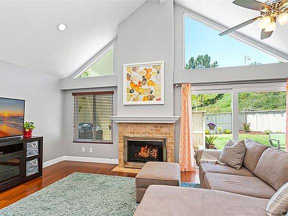 WOW! The least expensive DETACHED, SINGLE LEVEL home in all of Mission Viejo! Beautifully remodeled in the quiet community of Eastbrook, just steps to Lake Mission Viejo! Remodeled kitchen and bathrooms, hardwood flooring, recessed lighting, ALL windows and doors replaced, soaring ceilings with designer fans, repainted inside and out, new gas fireplace and mantle, new pavers in rear, private patio with ample grass area for children or pets, new garage door, indoor laundry...the list is endless! This home lives LARGE because of the layout, with each bedroom and full bath separated from each other on opposite sides of the house. The owners even re-designed the closets (walk-in in Master Bedroom) to maximize storage space. And the 2 car, attached, direct-entry garage has additional storage because of the pitched ceilings!