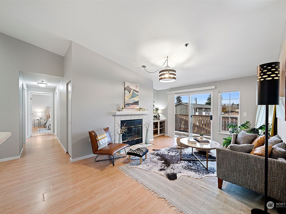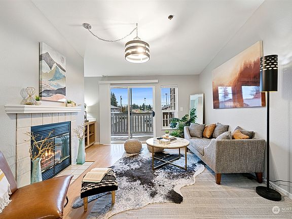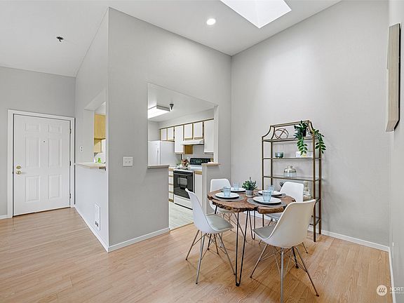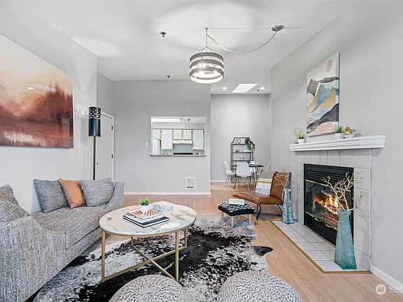 Welcome to this spacious, light-filled 2 bed/2 bath top floor end unit in Broadway Condos! When you walk in, you're greeted by the bright, roomy living room adjacent to the kitchen and dining area. This wonderful refreshed condo has VAULTED ceilings with a skylight and a cozy fireplace. Walk down the hall to the large bedroom, laundry room and bathroom. The primary bedroom offers a walk-in closet and full bath. The community features a recreation space, basketball court, tennis court and more! This unit is freshly painted, w/new flooring in kitchen, bathrooms, and laundry and is move-in ready! Near Boeing, shopping, dining, and easy to I-5, Hwy 99, and bus lines. No rental cap; one assigned covered parking space.