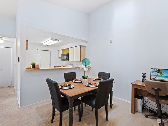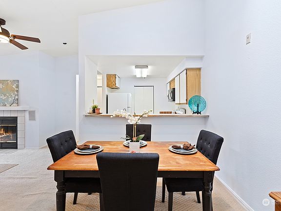 Welcome to this Spacious, light-filled top floor unit w/vaulted ceilings and Skylight. This corner unit has a spacious living area w/ cozy fireplace, dining room perfect for entertaining & slider to private balcony. Primary bedroom features an en-suite bathroom & plenty of closet space. Second bedroom has private access to the main bathroom. Updates incl: new toilets, water heater, wall heater, refrigerator & garbage disposal. Convenient storage, washer & Dryer in utility room, & covered parking spot conveniently located close to the unit. The community features a clubhouse w/indoor pool, hot tub, sauna, weight room, & sports court. Near Boeing, shopping, dining, and easy access to I-5, Hwy 99, and bus lines. No rental cap!