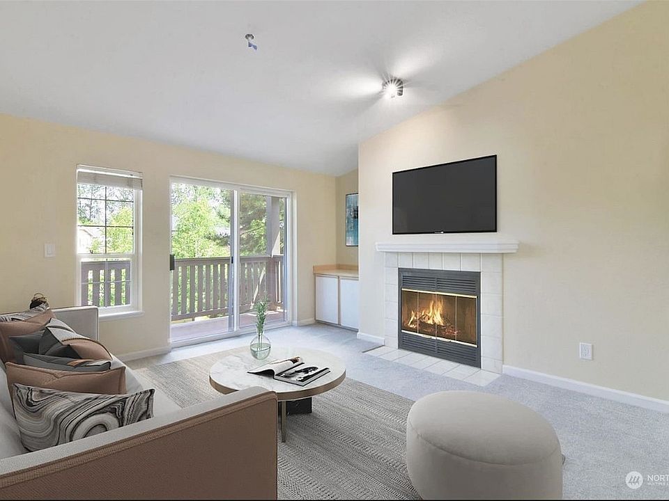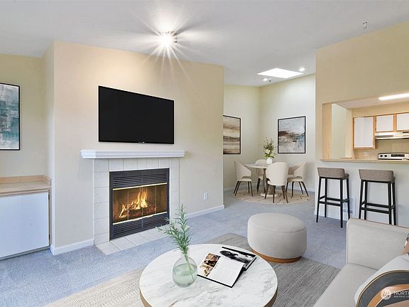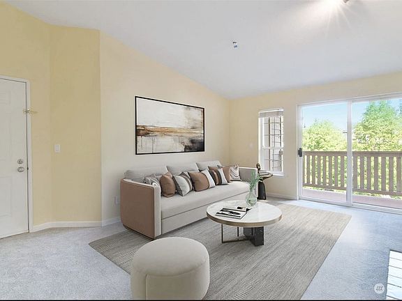 A ‘must see’ exquisite 3 bedroom residence! Situated in a prime location within the complex, this NE facing unit is bathed with natural light & perched on the top floor offering great views of lush trees for added privacy. Step onto the balcony to enjoy a glimpse of the Cascade mountains! This spacious & tranquil abode boasts vaulted ceilings adorned w/skylights & a cozy wood-burning fireplace. The primary bedroom features a walk-in closet with en suite bathroom. Fresh paint, new carpet & new appliances. Convenience is key with easy access to shopping, restaurants & grocery stores. The amenities include a clubhouse, indoor pool, hot tub, exercise room, sauna, tanning, party room, and a basketball court. Just minutes away from mall and more.