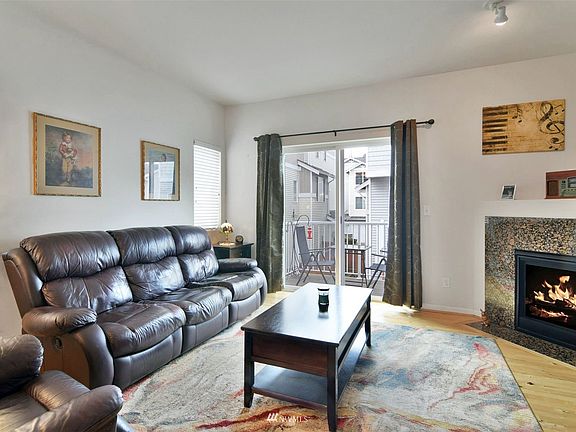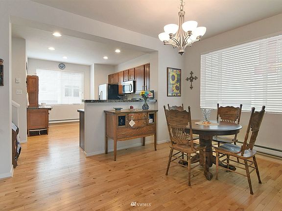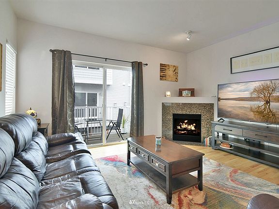 Lovely townhome features hard wood floors, new carpet on stairs and landing, gas fire place in living room & sliding doors to deck. Open plan kitchen with eating space, granite counter tops & an abundance of cabinets. Primary en-suite on the upper floor, 2nd bedroom, lots of closets & linen cupboards. Lower floor has a 2 car tandem garage & your private backyard. 2 minutes away from the swift green line stop set to operate between Bothell & Sea Way transit near Boeing Everett Plant. You'll love it here. Seller would appreciate additional time after closing. Park n Ride on 128th