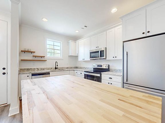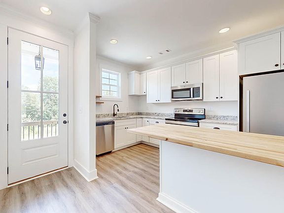 Fantastic 3 bed 2.5 bath townhome with garage in awesome location! New roof 2023! Nice LVP flooring throughout, No carpet! Beautiful kitchen with granite countertops, butcher block island/breakfast bar, range, dishwasher, built-in microwave and nice open shelving! Dining area! Large bright living room with ceiling fan! Owner suite on the main level with large walk-in closet, nice tile shower, and frame mirror! Spacious spare bedrooms with walk-in closets and ceiling fans! Jack-in-jill bath with tile shower, frame mirror and linen closets! Powder room perfect for guests! Laundry room! Covered back porch! Single car garage! Great location with easy access to shopping, restaurants and just across from The Village at Woodside with dining, healthcare, and other amenities to enjoy!