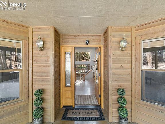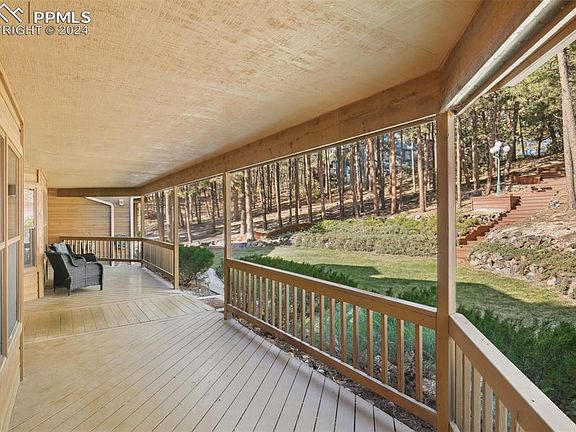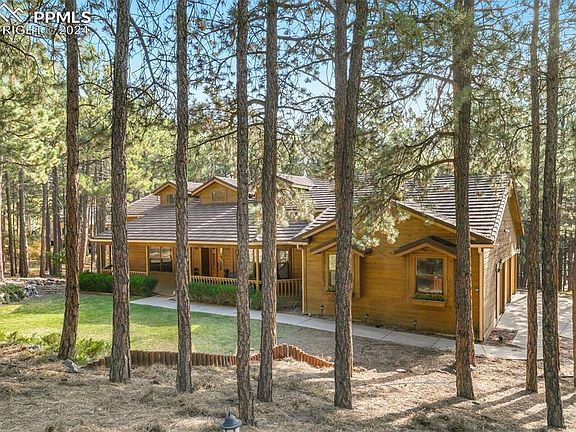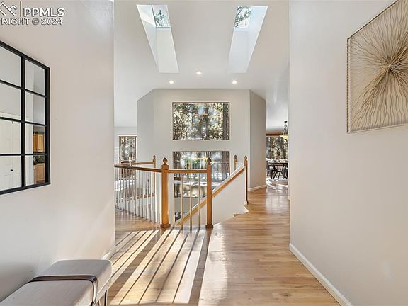 Welcome home to your woodland retreat! This distinctive and newly updated ranch-style home offers an inviting experience from the moment you approach the expansive front porch, perfect for unwinding and enjoying nature. Step into the foyer, where you will be drawn into the newly painted interior, skylights and large picture windows that bring the outdoors in, all of which creates a bright and airy atmosphere. Real hardwood floors are featured throughout the entry, kitchen and dining areas, and stairs, providing beauty and durability. The kitchen features granite countertops, a stovetop island, maple cabinetry, and two pantries, with an adjacent dining area that opens onto a large deck space overlooking evergreen trees. The living room boasts a charming wood-burning fireplace and deck access, ideal for cozy gatherings. On the main level, you'll find two spacious primary bedroom suites, each with soaring vaulted ceilings, newer carpeting, bay windows, and beautifully remodeled bathrooms with walk-in closets. The lower level is bathed in natural light from large windows overlooking the wooded lot and has a walk-out to the patio. This space includes a cozy family room, two additional spacious bedrooms, each with ensuite bathrooms and double closets, one with laminate wood floors (which could also be a great gym space!), and the other with new carpet a laundry room with sink and cabinet storage, and an ample storage area. The expansive garage offers three stalls plus a workshop area and includes a 240-volt outlet for electric car charging. The roof was recently upgraded with steel tiles, new gutters, and skylights, enhancing the home's durability and appeal. Enjoy fresh air and tranquility from the deck or front porch, with views of evergreen trees from every side. The Woodmoor area offers open spaces, trails, use of "The Barn" event center, and the benefit of Woodmoor Security patrols. If you're seeking serene Colorado living, look no further!