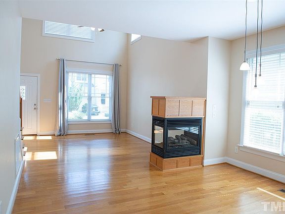 Simply beautiful. End townhome offers perfect scale and space for easy living. Craftsman-style maple cabinetry throughout, hardwoods & three-sided gas fireplace add warmth and style. Bright main floor bedroom and full bath. Generous master suite with walk-in closet looks out to natural beauty in back. Bright second bedroom, full hall bath & a roomy open loft that offers additional flexible space. Ideal location: the best schools, walk to Wegmans (soon) and easy commutes to almost anywhere in the Triangle.