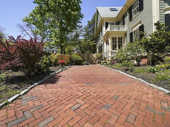 On prestigious Brattle Street in the famed Old Cambridge Historic District, minutes from Harvard Square, this beautiful historic home sits right across from Lowell Park and next to the grounds of a substantial estate. Tastefully updated in keeping with its classic style, this single-family attached home opens to a private backyard terrace and flower garden. A side driveway parks 2 cars. Bathed in sunlight, the inviting bay-windowed living room features a fireplace. Wide entryways connect into the understatedly elegant dining room and custom kitchen with breakfast area, marble counters and Thermador gas range. The second floor's sunny bay-windowed bedroom/family room has an office alcove adjacent. Having the third floor to itself, the extensive master suite brings added natural light through skylights in its office/library, airy cathedral-ceilinged bedroom, and dressing area off the bath. Served by its own full bath, the basement level has two rooms ideal for games or exercise.