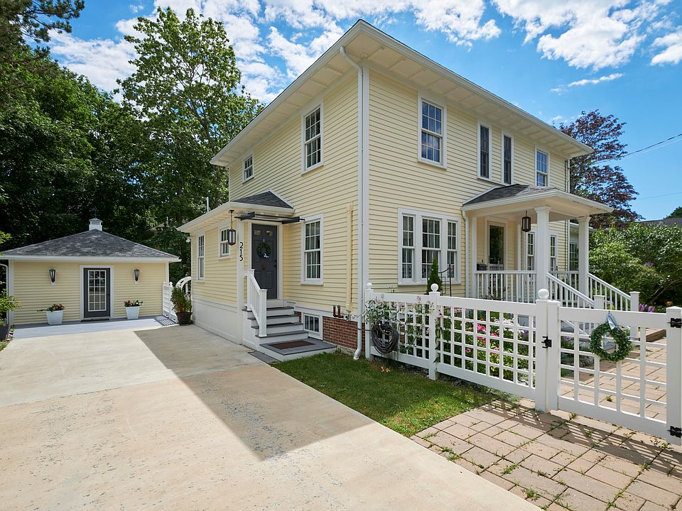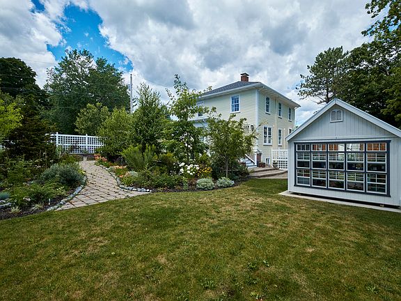 This tastefully restored and renovated 1927 house on a beautifully landscaped corner lot is a gardener's dream. Paths wind through specimen trees, shrubs & gardens past a very large greenhouse to a private rear patio. An ornate lattice-work, no maintenance vinyl fence surrounds the property. Step into the air-conditioned interior of the house with refinished hardwood floors throughout and you will immediately appreciate the fine period details including a coffered ceiling, built-in bookshelves and a wood-burning fireplace in the formal living room as well as the built-in china cabinet in the adjacent formal dining room. The well-equipped kitchen has granite counters and stainless steel appliances including a set of dishwasher drawers. There are plenty of cabinets and pantry storage, a center island and the sink has a greenhouse window that overlooks the lovely patio. Cheerful checkerboard vinyl floors accent the kitchen, the adjacent full bathroom as well as the mudroom entry. A cozy den off the living room with a sliding glass door out to the backyard completes the first floor. On the second floor, there are three bedrooms with large closets. A spacious hall bathroom with original period details including built-in drawers, a linen closet, a pedestal sink and an updated oversized stall shower maintains the vintage feeling of the house. The full height, dry basement is divided between a large finished side with full-size windows and a half bath that could be used as a home office, art studio or craft room. The equally large semi-finished/insulated side of the basement contains the utilities and a separate laundry area with an exit door to the patio. The original 1927 one-car garage was converted by a past owner into a studio. Used as additional storage space by the current owner, it could be converted back into a garage. An extensive list of improvements is included with the disclosures.