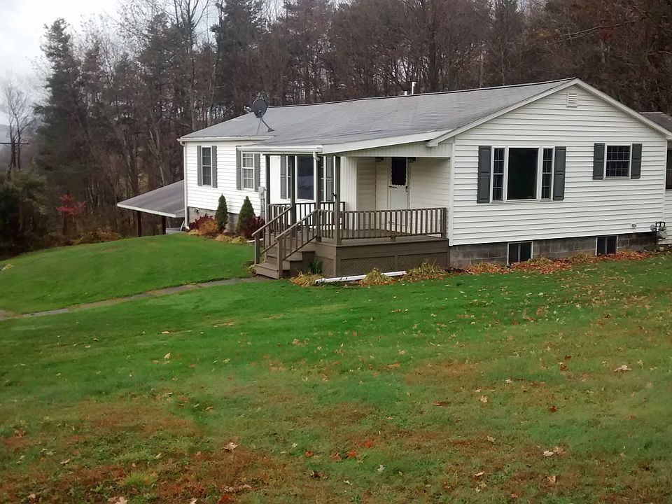 Here is a nice ranch house located just outside of town past the little league ball field. This 3-bedroom, 2 bath home has wood laminate flooring in the kitchen, dining and living areas; a stone fireplace with a gas insert in the living room, newer kitchen and appliances. The lower-level 400 sq ft den has a woodstove. The house is situated on .94 +/- acre, part of which is fenced in for dog care. There is a comfortable covered front porch, an enclosed back porch, a full walk out basement, a 2 car carport, plus a small shed and barn. Call for an appointment today!