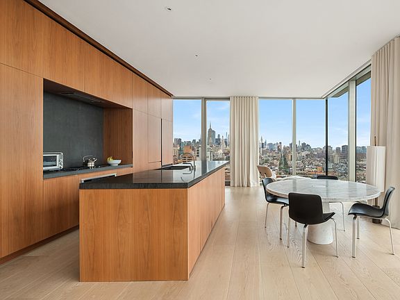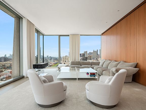 Welcome to this extraordinary half-floor, 2243 SF three-bedroom residence at 215 Chrystie St. meticulously designed by world-renowned architect John Pawson. Offering 270-degree panoramic views to the South, East, and North, this home spans 136 linear feet of uninterrupted floor-to-ceiling glass, including mullionless corner windows that invite the skyline in while maintaining serene privacy.
