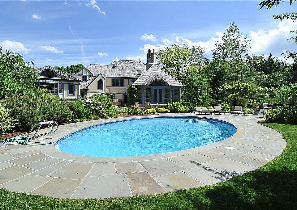 Country house designed by Dinyar Wadia for fun active lifestyle on 2 mid-country acres just off Round Hill with heated pool, tennis court and multiple terraces defining amazing outdoor living space. Chic, sun-filled interior with designer layout for today's modern living. 5 fireplaces; high ceilings; French doors in most main floor rooms. Big open living and dining rooms; fabulous vaulted, sky-lit Great Room; paneled study; large playroom; walnut office/library. The most stunning kitchen in Greenwich by Studio Dearborn with every amenity imaginable. Sun-room/remote learning space. 5+bedrooms, 6 baths plus staff quarters. Master w/ fireplace & balcony, his/her custom dressing rooms, marble bath. Exercise room; wine cellar; bonus room on new lower level. Generator; Garaging for 6 cars.