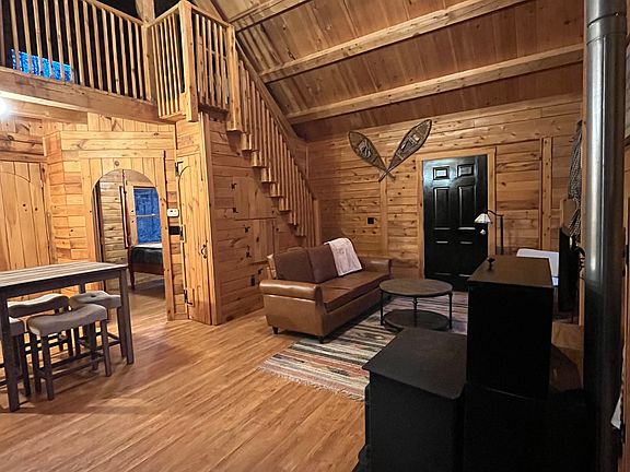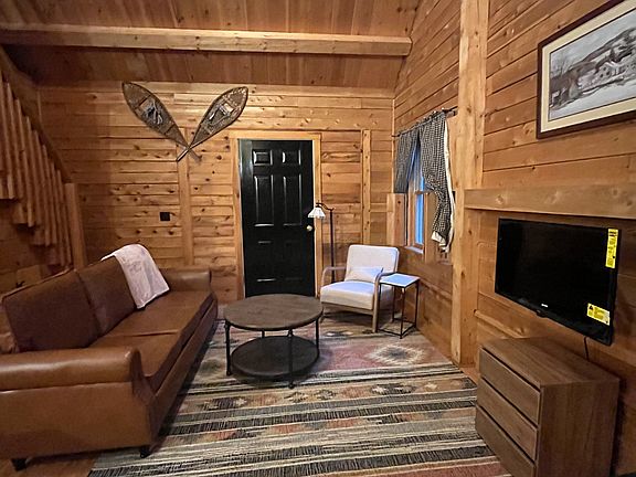 This property is furnished, has a high cathedral ceiling with a beautiful wood interior. It is in the process of getting an upgraded kitchen and bathroom. Progress photos upon request. The loft has views of the wooded yard and has twin beds. The twin beds could be switched with a queen. There is a 1st floor office/den or bedroom. The space is flexible to your needs. The front porch provides cover from the snow and summer enjoyment. This property has access to eight acres of woods and lawn for outdoor enjoyment.