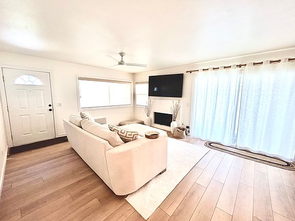 This open floor plan is filled with natural light. The modern kitchen features custom cabinetry, new appliances, and sleek countertops, flowing seamlessly into the living and dining areas perfect for entertaining or relaxing.