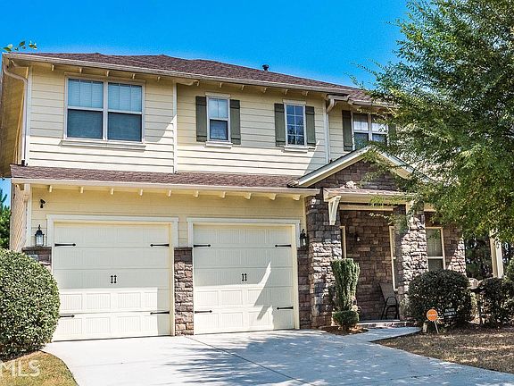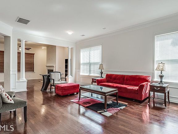 This Martha Stewart plan is beautifully maintained and situated in cul-de-sac of designer neighborhood with resort-style amenities. Main level open floor plan featuring hardwood floors and upgraded light fixtures throughout. Chef's kitchen with granite, huge island, butler's pantry, double stainless steel ovens, gas cook-top, built-in microwave, and breakfast room. Formal living room and dining room with floor-to-ceiling gas fireplace are accented by 3-piece crown molding, columns, and tons of natural light. Upstairs loft connecting to bedrooms. Oversized master bedroom can be an in-room office or lounge area. Large walk-in closets lead to garden tub and separate shower. back patio for outdoor entertaining. Minutes from shopping and Atlanta Airport. Vivint security system included. Swim/tennis community with clubhouse and playground included in HOA.