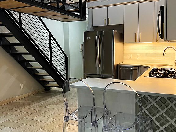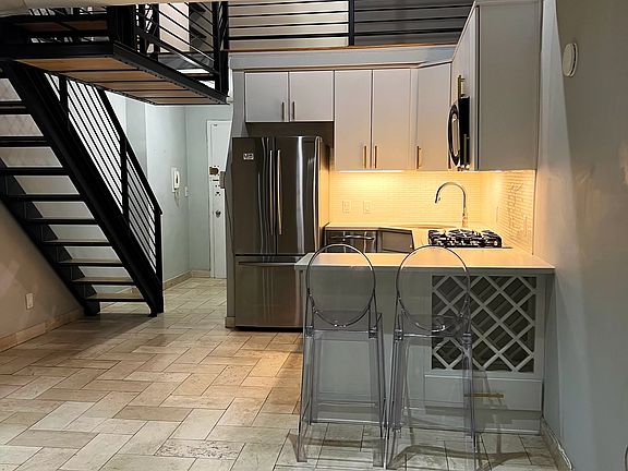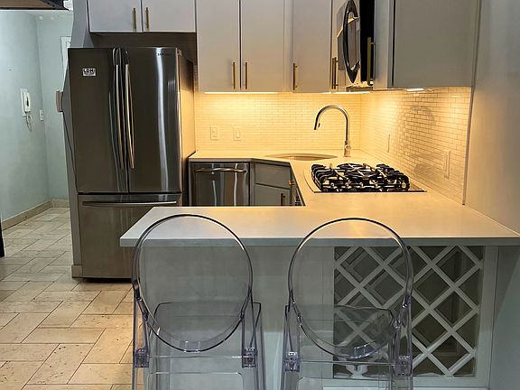 - Updated kitchen with quartz countertop, breakfast bar with wine storage, stainless-steel appliances, and custom under cabinet lighting (dishwasher, full size refrigerator/freezer, microwave and 4 burner gas stove/oven, microwave, garbage disposal)