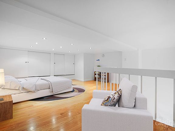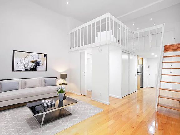 SPONSOR UNIT--NO BOARD APPROVAL! This lofted one bedroom + home office is nestled in the unique 'Penny Lane' building. This beautiful loft-style unit is designed to offer the perfect retreat from the daily bustle of urban living. This apartment features a 13' ceiling soaring overhead, floor to ceiling windows, plus gleaming wooden floors elegantly flowing underfoot. Upstairs is a sleeping loft with enough room for a home office, and is also equipped with generous closet space, which overlooks the expansive living room large enough for you to spread out and entertain friends. This home features a galley-style kitchen with stainless steel appliances including a dishwasher, as well as a lovely bathroom elevated with large-format wall tiles with a natural stone finish. Please note the ceiling in the bedroom loft is currently 5'4", but may have the ability to raise another 12-16". Please inquire for more details. Penny Lane is a 24 hour doorman building where you will enjoy the unique atmosphere of the European lobby and seating area, as well as the huge roof deck with panoramic city views. The building also has two laundry rooms on each floor, a live-in super, storage for rent, bike storage and a garage.