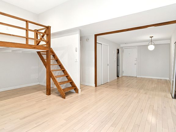 Blonde hardwood floors throughout, oversized windows, and a seamless layout set the stage for easy living. A spacious living and separate dining area invites both entertaining and quiet nights in, while the lofted sleeping alcove maximizes space and privacy. The crisp, renovated bathroom and modern kitchen complete with stainless steel appliances, dishwasher, and generous storage make daily living effortless. Abundant closet space and a private Juliet balcony add a rare touch of convenience and charm at this price point.
