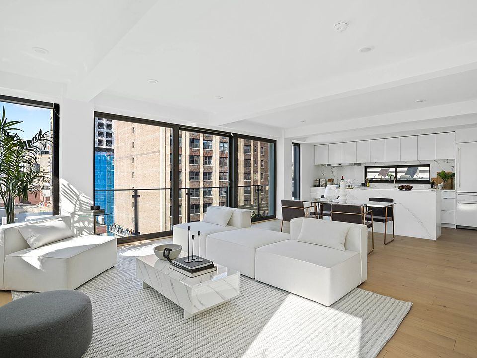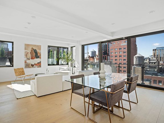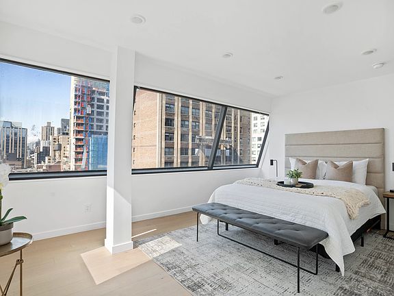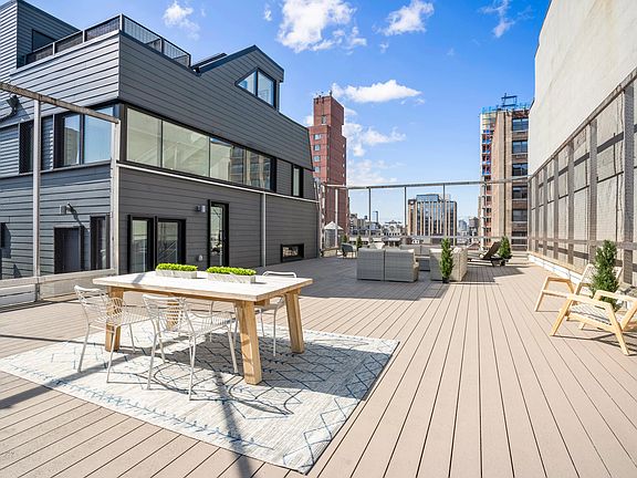 Welcome home to this newly built never lived in modern 3 bed 3 bathroom penthouse with massive 1800 square foot rooftop deck, plus two additional terraces! This is truly an outdoor oasis in midtown Manhattan. Enter directly from your private elevator landing to the combined open kitchen, dining, and living area, all with south facing windows and southern terrace, making this room feel open and bright. The new kitchen features a Miele dishwasher, GE Monogram refrigerator/freezer, Edgestar wine cooler, GE Monogram microwave and Verona 5 Burner Oven. The kitchen has a West facing window allowing even more light into the room. The main floor bathroom is complete with a Kohler toilet and fixtures. The first floor is completed by a small office / mud room area. The second floor contains the three bedrooms, two additional bathrooms, and an Electrolux Luxcare washer and dryer. The master bedroom has large walk-in closet, and ensuite bathroom with tub. Windows in the master suite face all four directions including a nice North facing window in the Master bath. The massive roof top deck spans 60 x 30 feet and gives the new owners countless options for entertaining, recreation, and more. An amazing oasis for enjoying fresh air and sunlight. There is an additional rooftop terrace one flight up with views in all directions and additional space to relax in the fresh air and sunlight. Subletting is allowed with board approval after 2 years of ownership. Co-purchasing, gifting, and pied-a-terre allowed on a case by case basis. This newly constructed home has maintenance of $4330. The building has a 24 hour doorman, live in super, privately owned garage with direct access from the building, Bike storage, additional storage lockers for rent, 4 roof decks, a newly built Zen roof deck, and laundry on all floors.