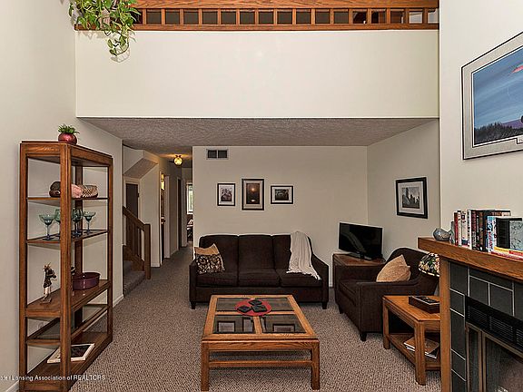 Welcome to 215 E. Jolly Road, #G10 --- darling condo, meticulously maintained in great location near downtown, MSU, hospitals, bus, shopping, restaurants! Vaulted, beamed ceiling in living room w/tiled frp, ceiling fan, skylight, paneled alcove for computer work area --opens to spacious loft which is perfect for 2nd living area & possible 3rd bedroom! Charming dining area has slider to very nice private deck - kitchen includes all appliances! Master bedroom is generous with own 1/2 bath plus 2nd bedroom & full bath off hall ---extra large storage area under stairs for especially big items or closet! Laundry room with washer/dryer is conveniently located in unit. Extra large basement has room for storage & separate finished room! Carport, one assigned parking space plus ample visitor spots! Many improvements including newer hot water heater, furnace & AC, low utilities! As drive in, 2nd right, middle stairway, above unit #4 to #G 10, Twin Oaks condos .