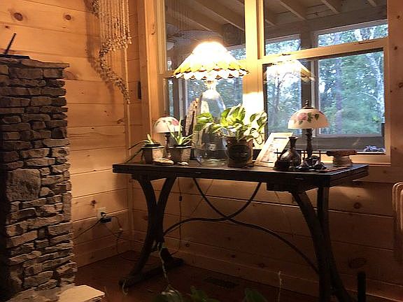 Log cabin with D-logs so the walls inside are soft wood Large 7’ high crawl space, covered 44’ deck. Added 20’ X 16’ wood shingle work shed. Tree clearing, extra gravel driveway. Plenty of parking. Front porch. Central AC/ heat pump/ gas fireplace. All new appliances (black stainless). Pantry and laundry room. Walk in closets. Two sets French doors in living room and bedroom. Extra windows in living room. Granite countertop. Wood chopping block island