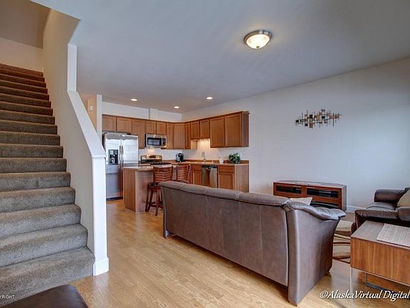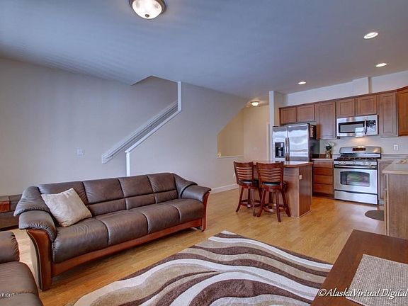 Beautiful Townhouse style condo just minutes from JBER. Large Master Bedrooms on separate floors with private bathroom & walk-in closet. Bonus area on top floor. Nice and open kitchen with center island. Beautiful laminate wood floors throughout kitchen and dining area. New carpet in stairway. Balcony. Great Southern Exposure! Close to shopping center.