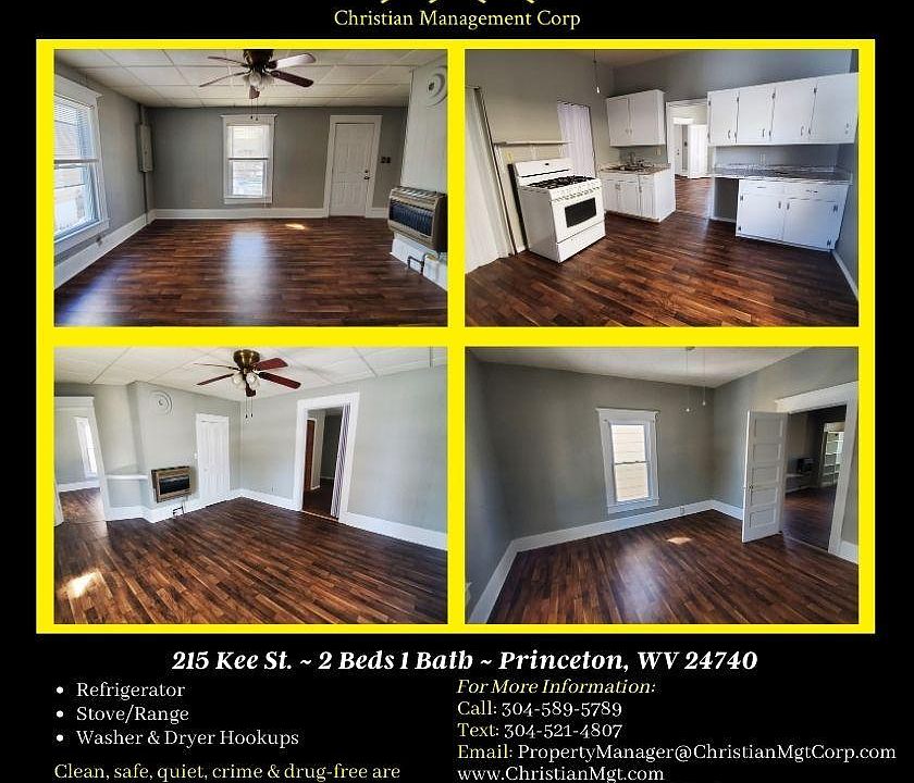 215 Kee St. ~ 2 Beds 1 Bath ~ Princeton, WV 24740 Janitorial Special: Don't want to wait? Take home as is and get $150 one-time credit to clean. LEASE OPTION (Path to Home Ownership): Initial payment: $2,500 with no payments due until the 1st of the following month! Monthly payment: $625/month. No utilities included. Sorry, this home is not HUD approved. This cozy two-bedroom one bath one level ranch house is approx. 1,000 sq ft and features fresh paint throughout, NEW vinyl flooring, new countertops and sink, large walk-in pantry off of the kitchen, washer & dryer hookup, a covered front porch, small flat yard, back deck, storage building, spacious rooms, and is located in the heart of Princeton within walking distance to Mercer Streets Grassroots District with Restaurants, shopping, banking and more! Be within walking distance to all downtown events like Autumn fest & The New Year's Ball Drop! Gas heat. Christian Management Corporation Office Hours: Mon-Fri 9:00AM-5:00PM & 10:00AM-2:00PM the 1st Saturday of every month You can view THIS property 7 days a week! Most pets welcome with a $200.00 pet fee per pet and signed pet agreement. Maximum 2 pets. No aggressive breeds due to insurance restrictions. Clean, safe, quiet, crime & drug-free are our priorities for our residents! We support Equal-Housing Opportunities! Good people with good, bad, low, or no credit but stable employment or Social Security are welcome. Criminal Checks: -NO recent felonies in the last 7 years -NO evictions in the last 7 years -NO sex offenders Is this property not what you are looking for? View our other available #homes, #mobilehomes, #apartments, and more on our Facebook or our website!