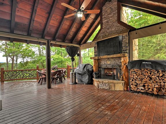 Nestled in the heart of the mountains, this stunning glass-front cabin offers the perfect blend of luxury, seclusion, and breathtaking natural beauty. Perched on a 2.83 acre ridge with layered views, this 3 Bedroom, 3 Full bathroom cabin is the ultimate retreat for nature lovers and those seeking an escape from the hustle and bustle. The floor-to-ceiling windows in the living area invite the outdoors in, flooding the space with natural light and offering unobstructed views of the dramatic mountain landscape. Imagine sipping your morning coffee while watching the sunrise paint the sky in hues of pink and orange, or unwinding in the evening as the sun sets, casting golden light over the peaks as you enjoy the wood burning fireplace on the porch! The open-concept design allows for entertaining guests. The living room is anchored by a cozy, stacked stone fireplace, creating a warm and inviting atmosphere all while enjoying friends and family from the Dining and Kitchen area. Each Bedroom allows for privacy from every level with the Primary En Suite on the upper level with a private deck overlooking the mountain vista. The Lower Level living area is the perfect Man Cave with an additional stacked stone fireplace with TV above and a whiskey bar. Step outside onto the expansive decks on both levels, where you can take in the views and serenity.This cabin is not just a home—it's a lifestyle. Perfect for year-round living, a vacation getaway, or even an investment property. Experience mountain living at its finest!