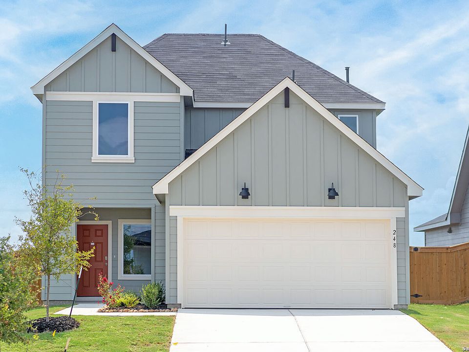 MOVE IN READY. EASY ACCESS TO I-35! The Nicole is our largest floorplan available at our Trace community in San Marcos, Texas. This two-story home offers 4 bedrooms, 3 bathrooms, a gameroom, and 2 car garage all within 2,473 square feet of comfortable living space. Our homes in Trace feature farmhouse exteriors. Entering the home from the covered front porch, cross the foyer and find a short hallway to the downstairs secondary bedroom and a full bathroom. Passing the stairwell, continue through the foyer to the heart of the home, the living area. The family room, dining area, and kitchen are open, making entertaining and everyday living a shareable experience for family and friends. The kitchen features quartz countertops, a large island with undermount sink, a corner pantry closet, stainless-steel appliances and 36'' upper cabinets. Moving upstairs, you'll enter the gameroom, the center of the upstairs space. The oversized primary bedroom is tucked away from the gameroom. Stretch out and relax at the end of your day in this spacious and private ensuite. The primary bathroom features a walk in shower, double vanity, separate toilet area with a door, and an enormous walk-in closet. This will be the closet of your dreams, spacious enough to add a dressing island or chaise lounge for a full luxurious experience. The additional upstairs bedrooms and bathroom are located opposite the primary bedroom. The bedrooms feature walk in closets with shelving. Both secondary bathrooms include a shower/tub combination. The utility room rounds out the upstairs space, making laundry chores a breeze. The Nicole includes vinyl flooring throughout the common areas of the home, and carpet in the bedrooms, gameroom and stairwell. All our new homes feature a covered back patio, full sod, an irrigation system in the front and back yard, and a 6' privacy fence around the full yard. This home features our America's Smart Home base package, which includes the Video Front Doorbell, Front Door Deadbolt Lock, Home Hub, Thermostat, and Deako Smart Switches.