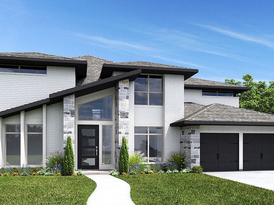 Curved staircase highlights two-story entry. Home office with French doors and formal dining room set at entry. Two-story family room with a sliding glass door, decorative beamed ceiling, and corner wood mantel fireplace opens to kitchen and morning area. Kitchen features walk-in pantry, 5-brner gas cooktop and island with built-in seating space. First-floor primary suite with wall of windows. Dual vanities, freestanding tub, separate glass-enclosed shower and two walk-in closets in primary bath. First-floor guest suite offers private bath. A game room, media room and three secondary bedrooms are upstairs. Extended covered backyard patio. Three-car garage. Representative Images. Features and specifications may vary by community.