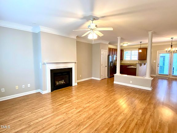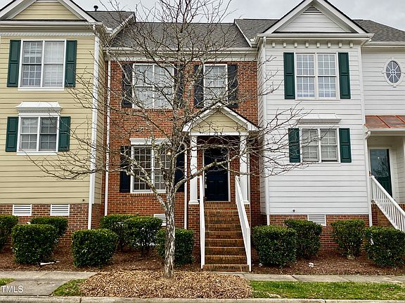 Carpenter Village Precious Neoclassical Neighborhood Traditional Brick Front 2 Story Townhouse with detached 1 car garage, laminate hardwood floors on first floor with open living with gas fireplace, decorative columns divide dining, kitchen with rich wood cabs, stainless appliances, refrigerator , smooth top range, micro, dishwasher, granite countertops, pantry, upstairs washer and dryer in hall closet, building shelving, 2 bedrooms each with private bathrooms, primary valued ceilings, fan, oversized soaking tub, rain shower, elfa custom closets, private fenced backyard to detached rear loaded garage, Heating Jan 2024, AC 2016, Carpet '22, refrig '23, disposal '23, yard, maintained, termite, pest HOA, Swimming Pool, Park, Gazebo, Shopping Retail, near RDU & RTP, Must own for 2 yrs before rental