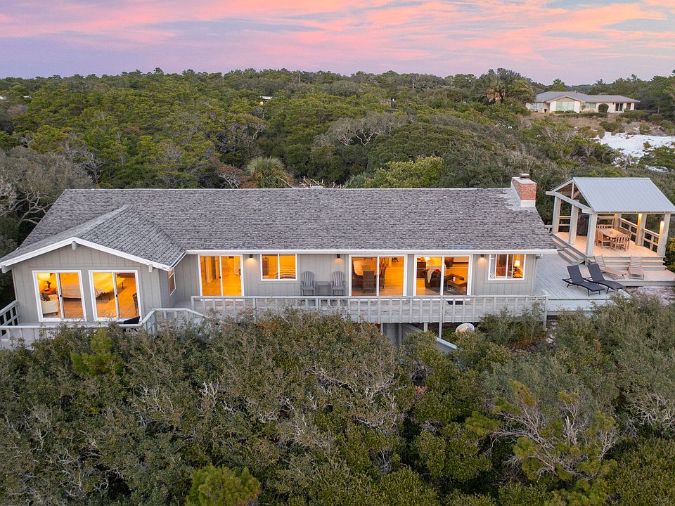 Nestled in the highly coveted Four Mile Village, Mockingbird Lane offers an exceptional opportunity to own a stunning luxury home nestled on an acre lot with panoramic views of the Gulf of Mexico. Perched on a hill and surrounded by lush trees, this private retreat offers the perfect blend of tranquility and natural beauty. The home features expansive living spaces with floor-to-ceiling windows, allowing Gulf views to be enjoyed from nearly every room. With four spacious bedrooms, including a master suite with direct balcony access and sweeping ocean views, this residence is a luxury! The open-concept living area is ideal for entertaining, with a modern kitchen, formal dining room, and cozy living area with a wood-burning fireplace.In addition to the main house, the property inc
