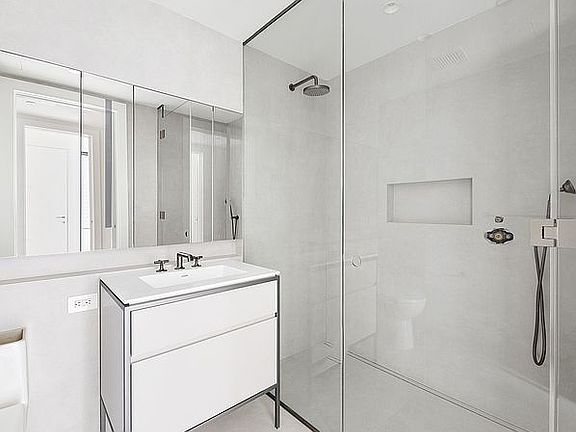 Expansive bathrooms feel even larger with large format floor to ceiling European porcelain tile throughout, creating a seamless, spa-like environment in primary bathrooms. Each bathroom features custom-designed Morris Adjmi anthracite plumbing fixtures for a unique, minimalist modern tone. For the perfect morning and evening routine, vanities illuminate with mirror-mounted lighting.