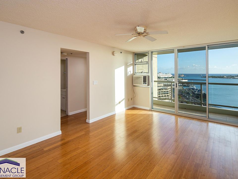 Remodeled 2 bdr/1 bth condo in newer built bldg in downtown. Spacious living room leading out to a lanai with gorgeous views of the ocean and city. New paint, upgraded bamboo flooring, new bathroom cabinet and lighting. AC and washer/dryer inside unit. Includes 1 cvd parking stall. Secured bldg close to downtown, Ala Moana, Ward Village, shopping, and highway access. No pets. 1 year lease. Water and sewer included. No pets.