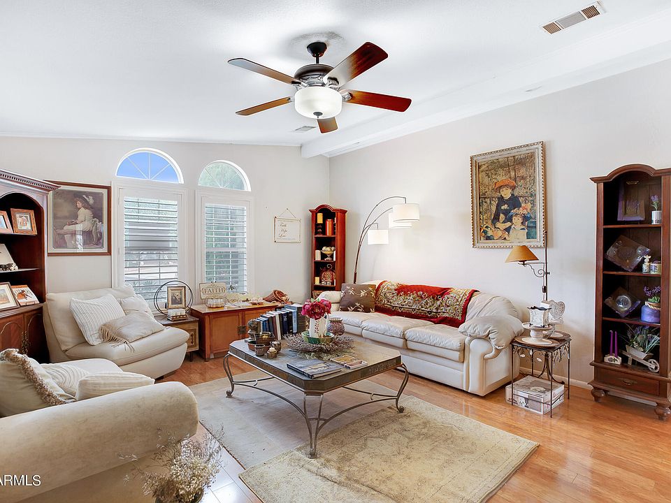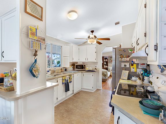 Highly Desired Las Palmas 55+ Community. Clean well maintained and cared for home. Recently updated interior paint and wall texturing, updated bathrooms, French doors, interior cabinets painted, resurfaced counter tops, updated kitchen, replaced washer dryer and fridge, plantain shutters throughout, Beautiful finished Arizona room. Home backs up to huge green belt area. Light and bright master bedroom with sitting area that can used office or den or TV room. Beautiful landscaping front and back including fruit trees and mature shade trees in back yards. Ceiling fans throughout. Community many amenities including country club like clubhouse, heated pool, Spa, Fitness center , dog park, tennis courts, pickle ball courts, billiards