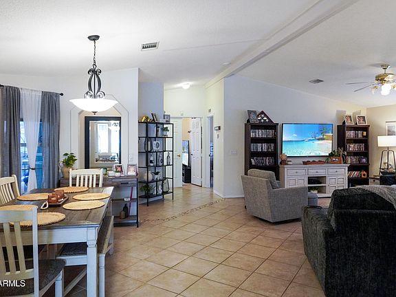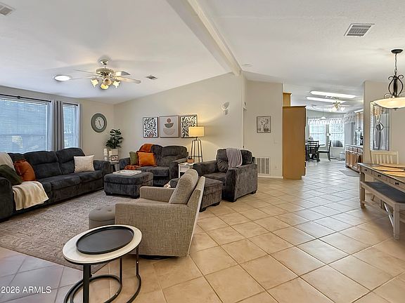 This home is something special—in the best, pinch-me way. With 2 bedrooms, a den/office, and 3 full bathrooms, the split floorplan delivers space where it matters most and privacy where you want it. The oversized living area flows right into a kitchen made for entertaining and cooking, complete with a cozy breakfast nook for morning coffee and the paper. The enclosed Arizona room with its own split system opens the door to endless possibilities—studio, hangout, hobby haven. Inside laundry, tons of storage, and a private paver patio out back with space for dining, citrus trees, and relaxing evenings. And the kicker? Located directly across from the clubhouse and pool—walk to all the activities and live where the fun is.
