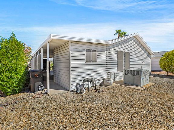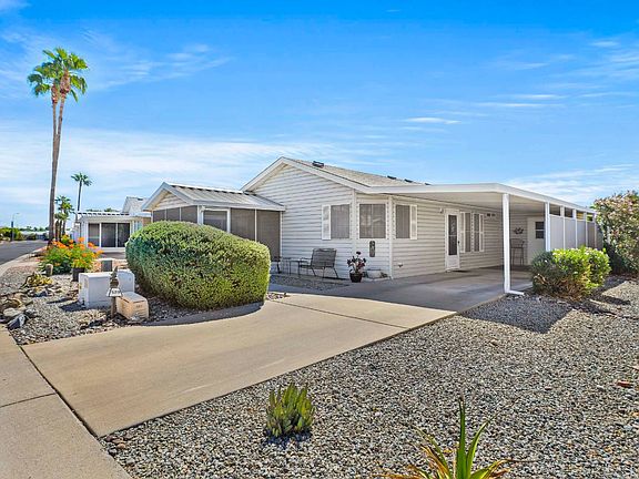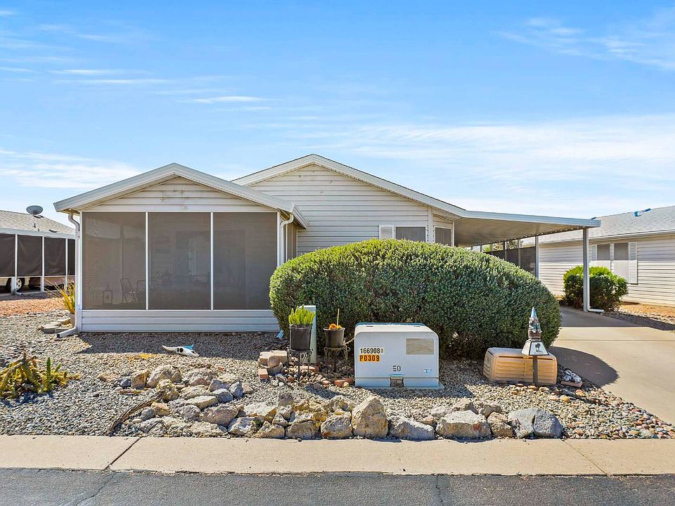 Experience the Thesman Lifestyle at LasPalmas, an active 55 plus land lease community where luxury meets affordability. For over 40 years we have set the standard with world class amenities and year-round activities. LasPalmas is a 24-hour gated community, with a beautiful 20,000 square foot clubhouse including ballroom, fireside lounge, library with computers and individual rooms for cards, billiards, arts & crafts and fitness center. Enjoy outdoor amenities heated pool & spa, BBQ area, pet park, sport courts for pickleball, tennis, bocce, shuffleboard and basketball. Our activities director assures a full calendar of social and recreation events. Our shuttle bus makes it easy and convenient to attend sporting and special events, plus local shopping. Whether you want to relax or stay active our vibrant communities offer everything you need to enjoy life to the fullest. Discover LasPalmas and start living the Thesman Lifestyle today! This 2-bedroom/2-bathroom floorplan is perfectly sized as a winter getaway home. Light & bright kitchen with a breakfast bar overlooking the dining/living room area with an adjacent AZ screen room to enjoy the lovely AZ weather. Nicely sized second bedroom is perfect for company or for use as a home office/craft room. The primary bedroom has a walk-in closet and private bathroom with walk-in shower. Shed for additional storage. This home is waiting for you to put your personal touch on it! BRAND NEW ROOF AND WATER HEATER! Motivated Seller! Available immediately! All appliances included Mature landscaping.