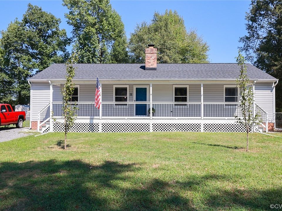 Prepare to fall in love with this charming one-story home with a full front porch, which creates tons of curb appeal, and a huge rear screened porch. Inside you'll find a spacious great room with laminate flooring and a wood stove; a dining area with laminate flooring; and a kitchen with tile floor and an entrance to the screened porch. The kitchen features a stainless sink with a gooseneck faucet, a GE smooth-top stove, a Maytag dishwasher, and a built-in microwave. The primary bedroom with an attached full bathroom is on one side of the house, and the other two bedrooms share a full bathroom on the opposite side. Both bathrooms feature tile flooring and mirrored vanity cabinets. The exterior of the home offers low-maintenance vinyl siding, a newer dimensional roof, and gutters. There is an attached storage room (12' x 10') with both interior and exterior access that would also make a nice walk-in closet off the primary bedroom. The rear yard features loads of space for gardening and/or entertaining. Showings begin Saturday, the 16th!